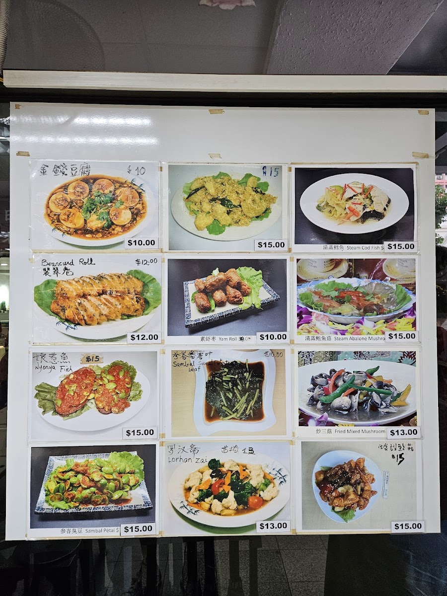 The fried rice section brings bold flavors through choices like 香椿炒饭 Ceder Shoot Fried Rice, 黄梨炒饭 Pineapple Fried Rice, 东炎炒饭 Tomyam Fried Rice, 火腿炒饭 Ham Fried Rice, and 参峇炒饭 Sambal Fried Rice, while the Western food offerings-鱼扒 Fish & Chips, 鸡扒 Chicken Chop, and 薯条 French Fries-add a casual, international touch. Particularly notable is the extensive vegetarian seafood lineup, including 砂煲亚参鱼 Claypot Assam Fish, 清蒸鳕鱼 Steamed Cod Fish, 娘惹鱼 Nyonya Fish, 鱼翅 Shark Fin, and 鱼头火锅 Steamboat Fish Head Soup, which showcases creativity in plant-based cooking.